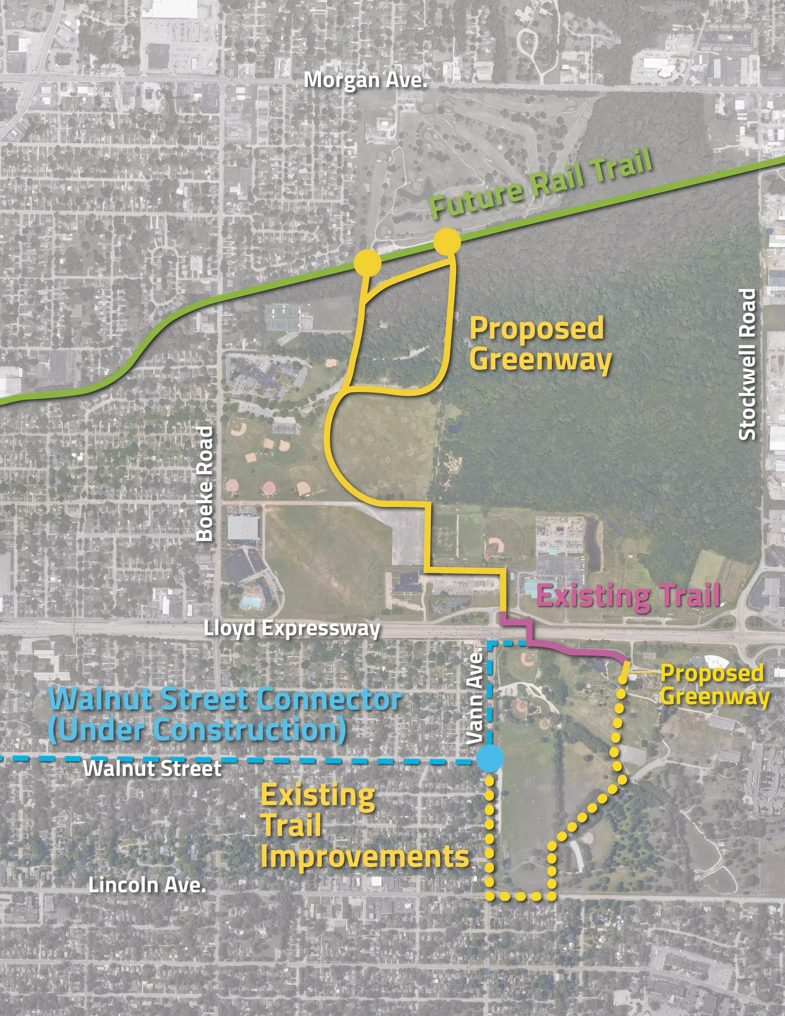 ou may see additional information HERE.The Walnut Street Improvement project section at Bob Jones Way ribbon cutting was held August 10, 2018 and is adjacent to the Stone Family Center for Health Sciences building and continues to Martin Luther King, Jr. Blvd, onward toward Vann Avenue. The Walnut Street multiuse trail from US 41 to Weinbach Avenue section was completed in 2022. The final phase from Highway 41 to Martin Luther King, Jr. Blvd. was completed in the fall of 2025. This vital center-city connection brings connection from the Riverfront Greenway to Vann Avenue. New in 2026 will be the Indiana Next Level Trail grant program(a DNR program as an initiative of Indiana Governor, Eric Holcomb, 2017-2025, Robert’s Park Loop Trail in 2026, adding a 2.2+ miles to the trail count from Wesselman Park to Vann Avenue.